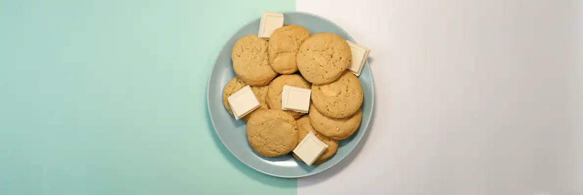 Tereyağlı, ince dokulu kurabiye tabanına, eriyen beyaz çikolata parçaları eşlik ediyor. Ne fazla süslü, ne de sıradan.